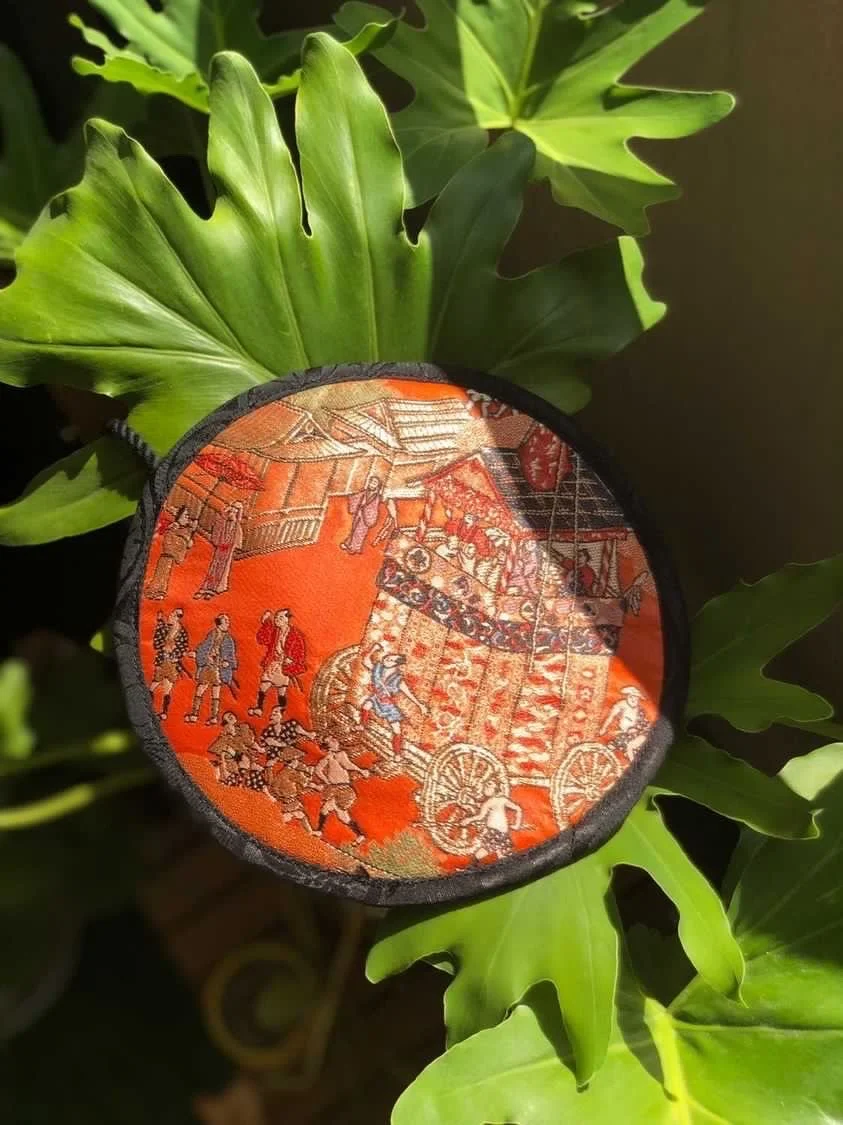 This obi was made in the Nishijin district, weaving district of Kyoto. We can observe textured elements (scenes and characters) on a plain bright orange silk background. The motifs are accurately detailed, which is one characteristics of Nishijin fabrics.