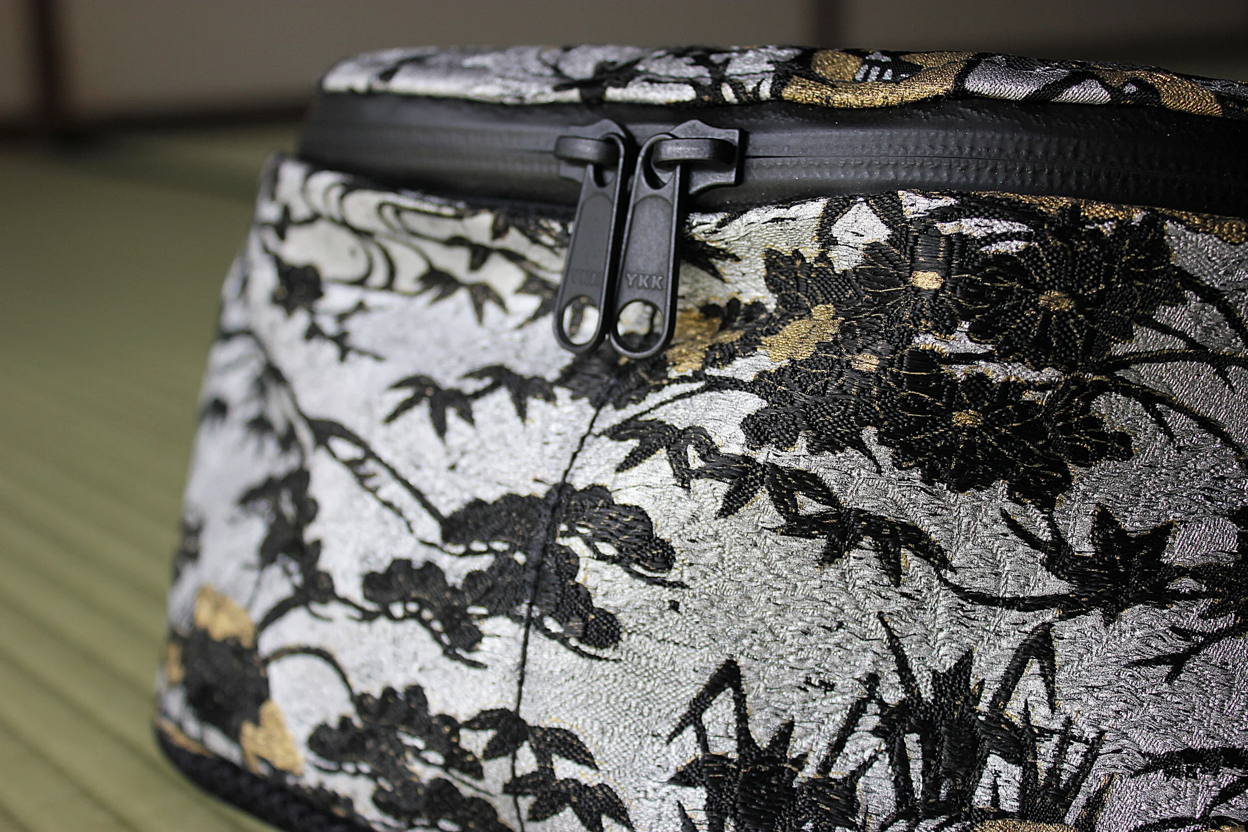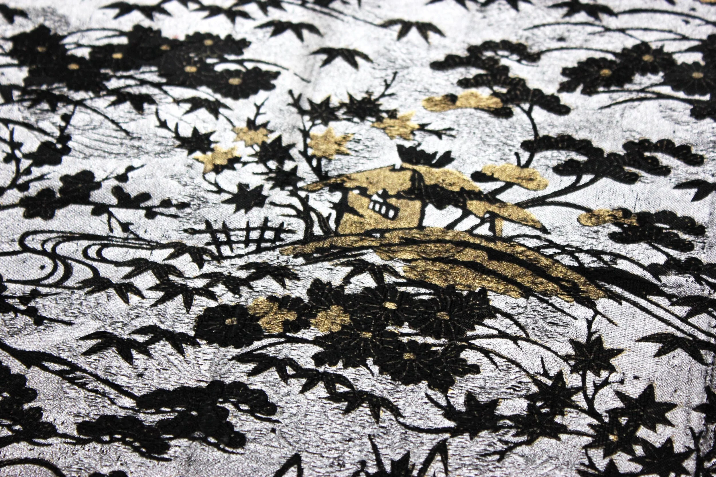 This obi seems to have had a previous life already! When looking at it closely, you can observe another pattern underneath, which appears in the texture. In fact, we can guess the shape of chrysanthemum and flying cranes here and there. The previous design, a classic jacquard obi, was completely re-dyed in black before overlaying it with the new design, using the silk screen printing technique.