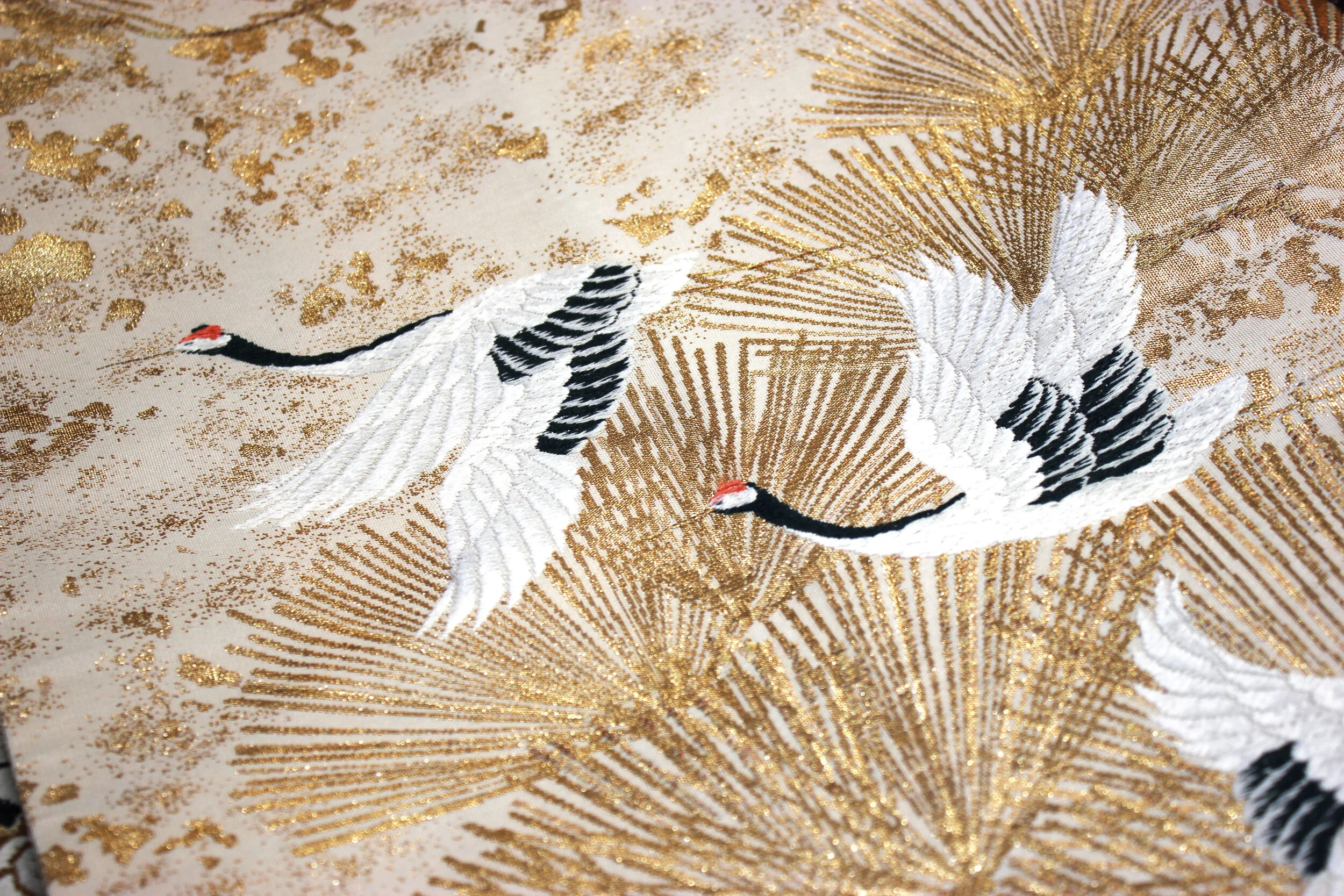 This obi is composed of a smooth background, on which textured cranes are flying, and is designed for a bridal outfit.