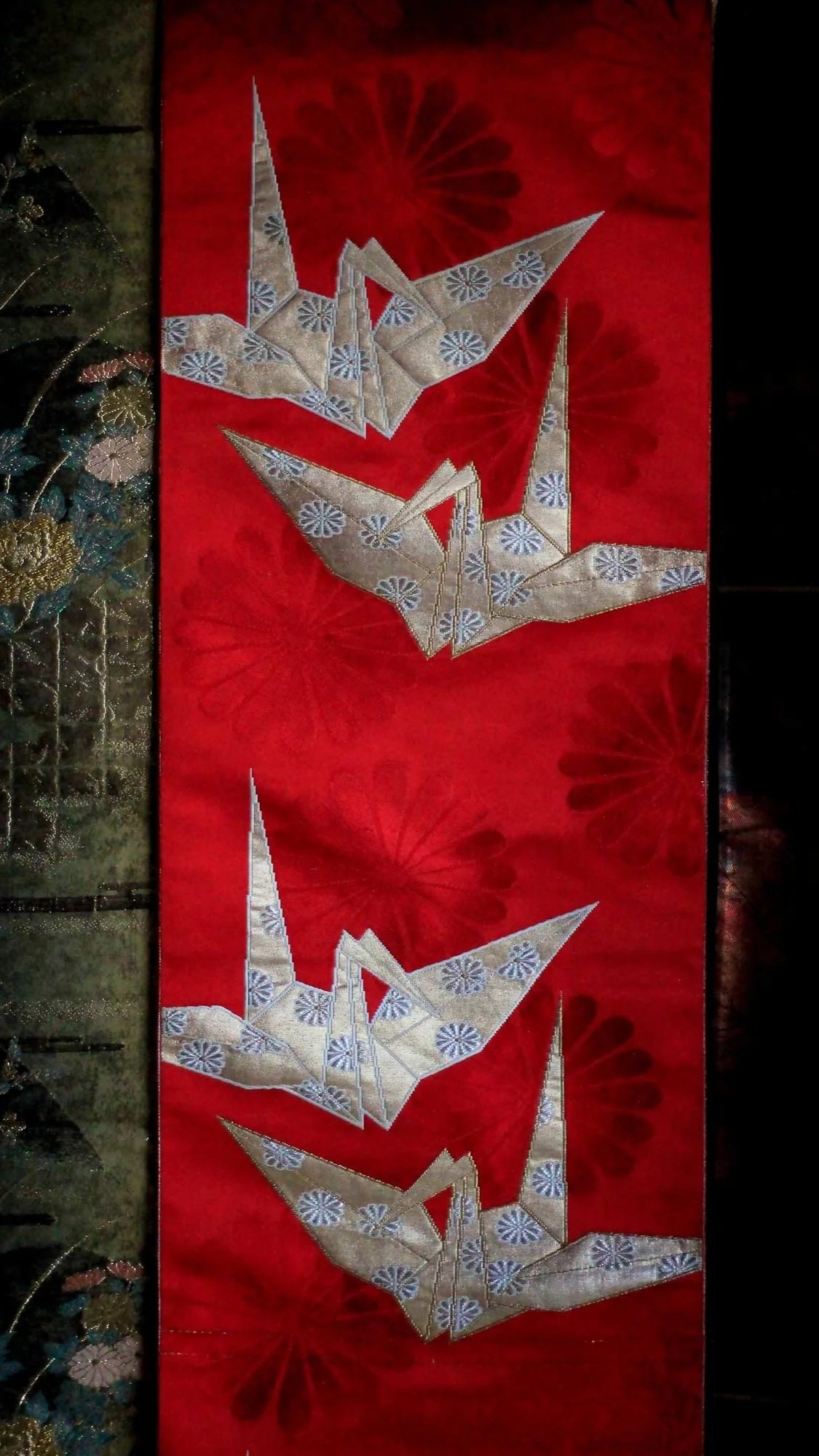 This obi is woven with silk and gold lamé threads. The crane motif is woven with lamé and white, which highly reflects light. As you can see in the image below, the cranes shine bright from a certain angle and become more discreet from another angle, while the big chrysanthemums at the back darken