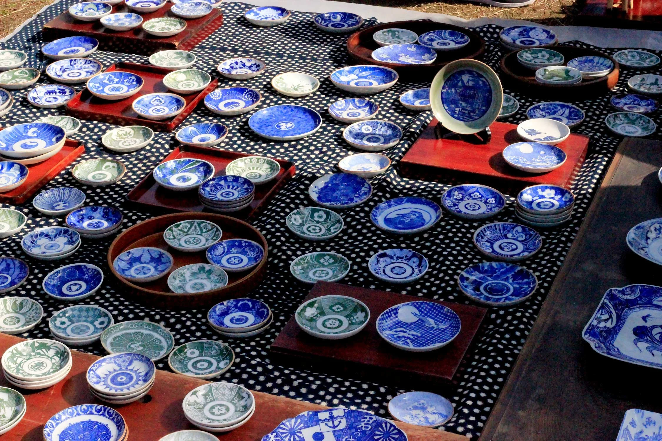 Held on the 10th of each month, it is a little smaller than the other two, but it is the most curated flea market of Kyoto. It is held right in front of the shrine in Okazaki Park and gathers sellers who are professionals and individuals. You will find the same kind of objects as the other flea markets but also some booths specialized in one particular object, like this ceramic seller in the image below.