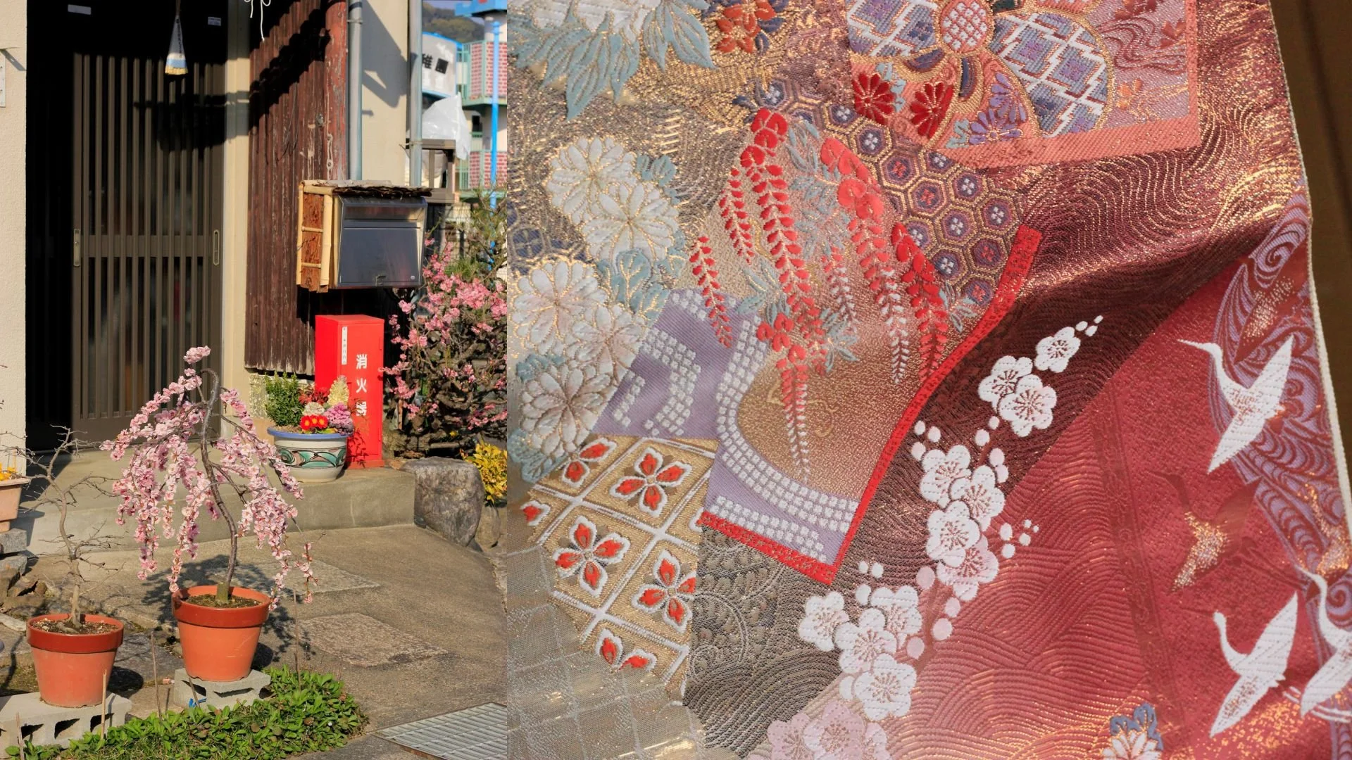 Plum blossoms from the bonsai on the doorstep or woven of silk, which is your favorite?
