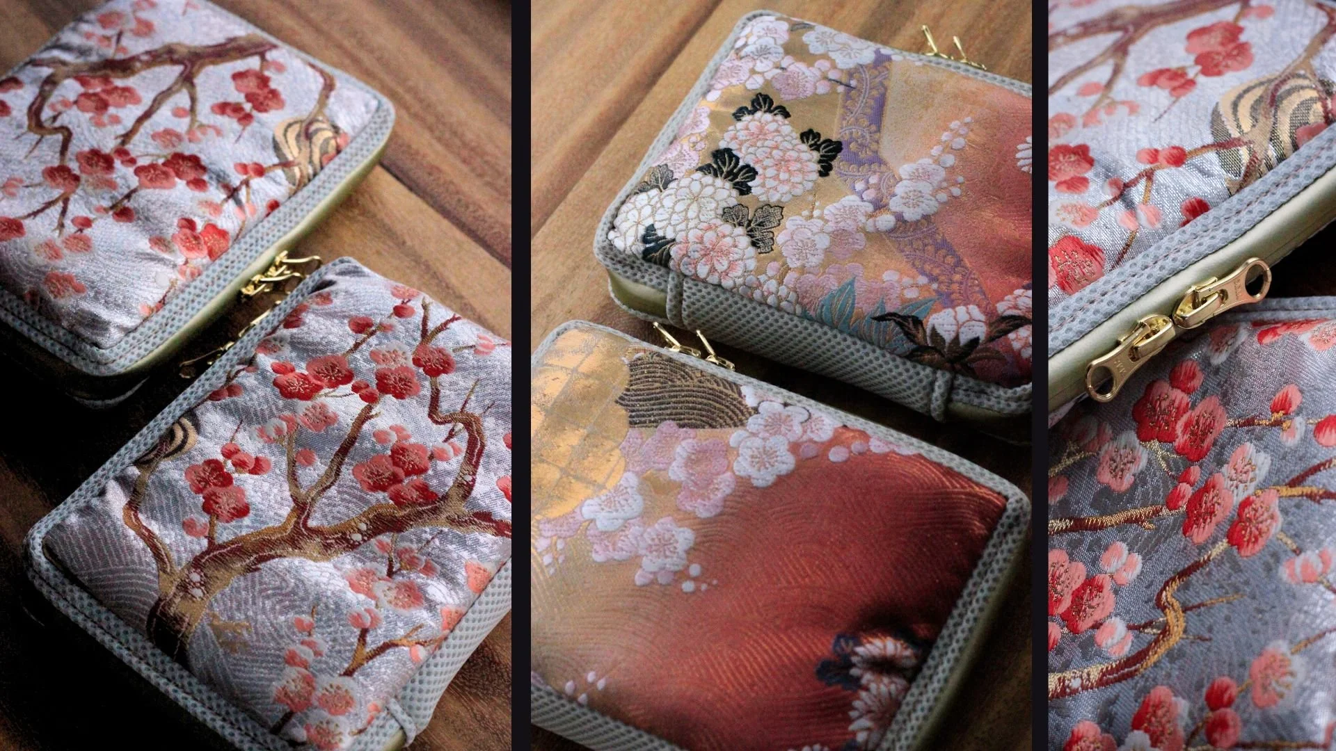 A set of travel pouches made of two very seasonal obi: pine, plum and bamboo, when represented together are also called “the three friends of winter”. A very auspicious symbol! We created these two bags with customers who I also had the chance to guide in the area the rest of the day so they picked fabrics that reminded us of what we saw.