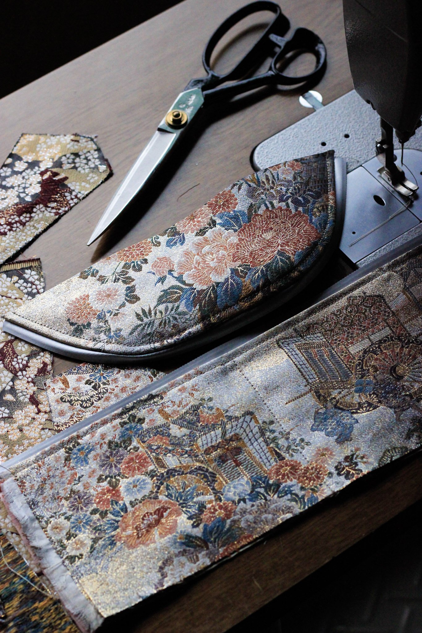 I will welcome you in one of my studio in Arashiyama. You will choose your favourite fabric from a selection of antique Japanese kimono and obi and we will start the process together. Once we shape all the details ( for example how to frame the exact part of the motif that you want), I will create your bag according to your wishes while you carry on your Kyoto adventures. Your custom-made bag will arrive at your hotel during your stay or after you return home from Japan.