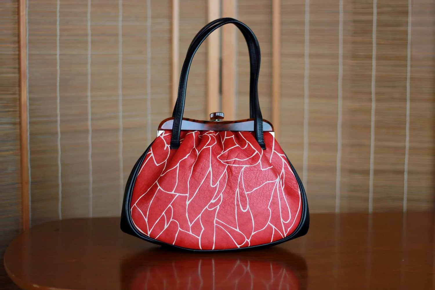 This vintage pouch, or small handbag, is made of genuine leather consolidated with a sturdy structure. The material is made with thin painted leather strips woven with silk. This wonderful fabric is the result of a fine technique that is still manufactured by a small number of companies around Japan.