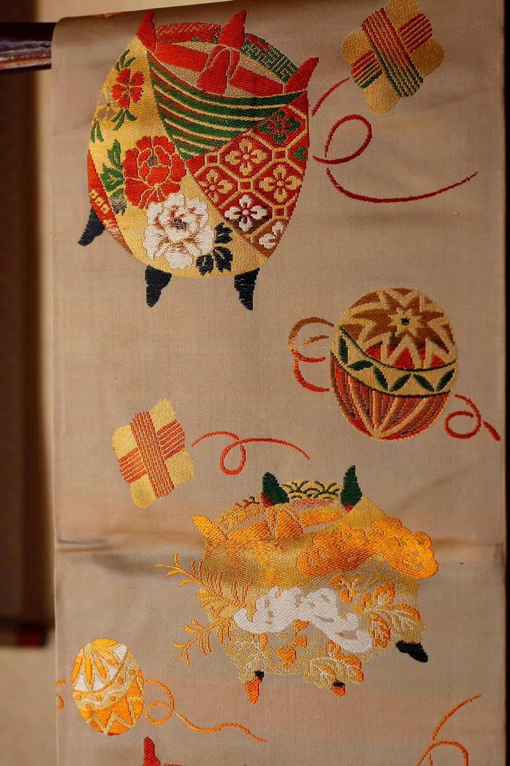 This obi showcases three objects that share the commonality of being wrapped with silk threads. As a sewing enthusiast,you can imagine I thoroughly enjoyed coming across these motifs! Have you seen them before?