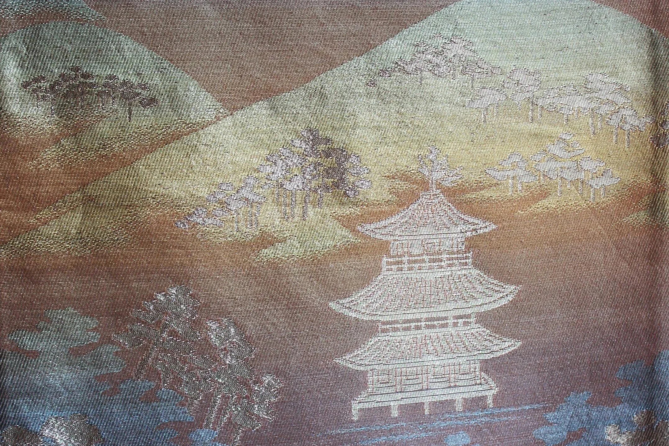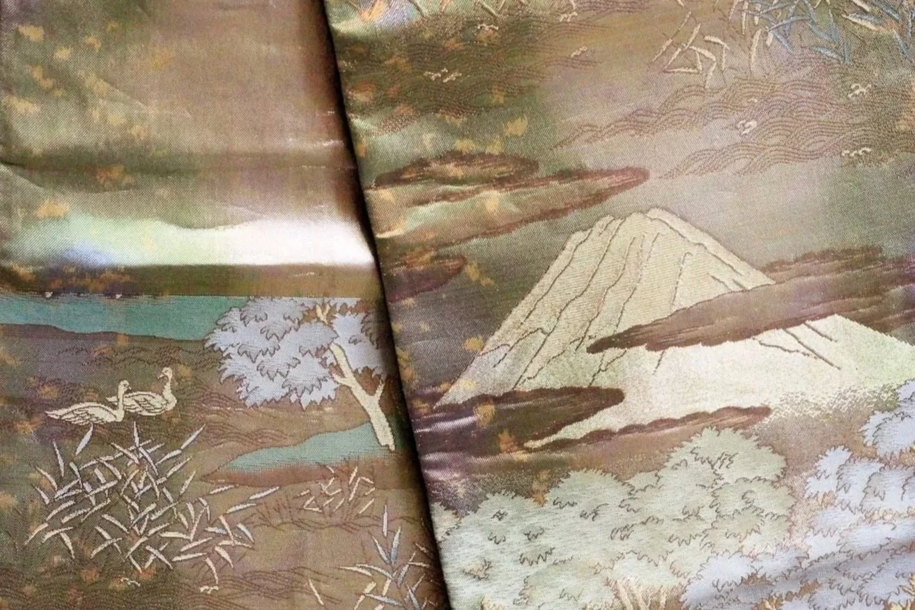 This obi is made of silk woven together with washi paper covered with gold and metal leaves. This technique is callled hikinuki.