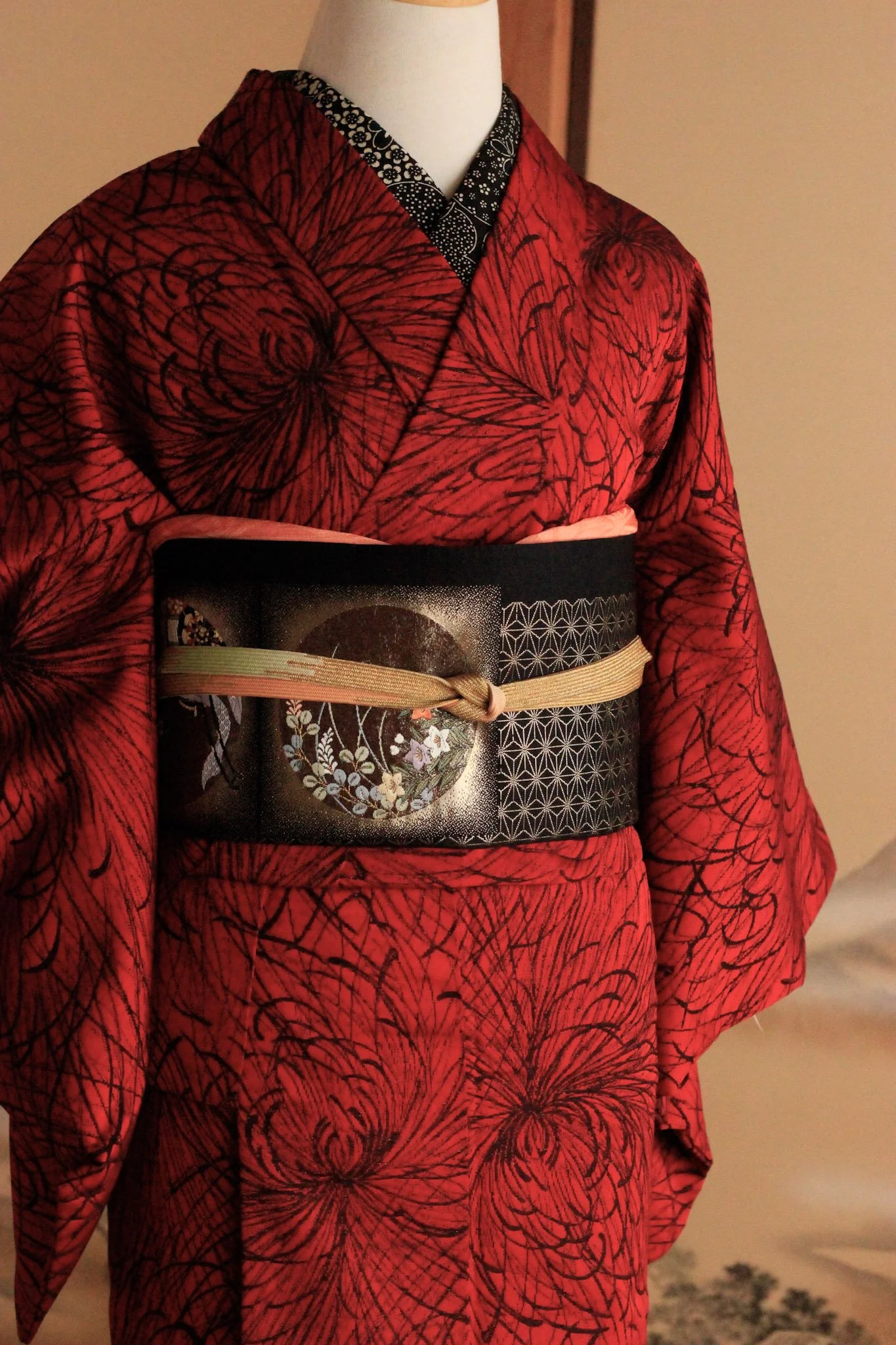 Rather than representing one season, this obi displays a combination of various seasons which allows to wear it all year long. Each element is arranged in a round frame, reminding us of the round windows we can observe in some traditional building, from which you can usually see a specific tree or plant.
