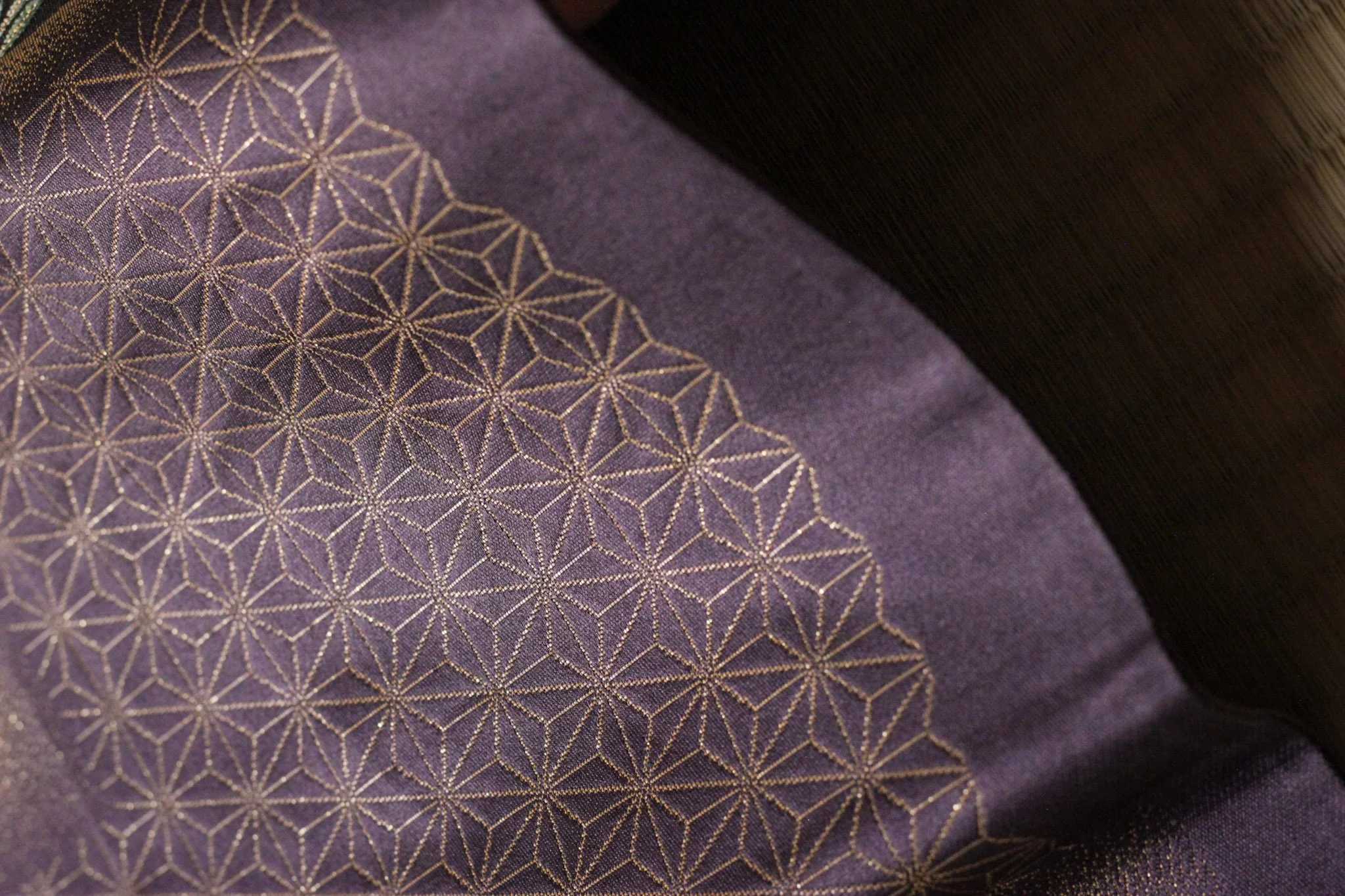 Simple and delicate, this obi represents various flowers into circles, framed with a traditional asa no ha motif. Asa no ha is a very popular motif that represents hemp leaves in a geometrical way.