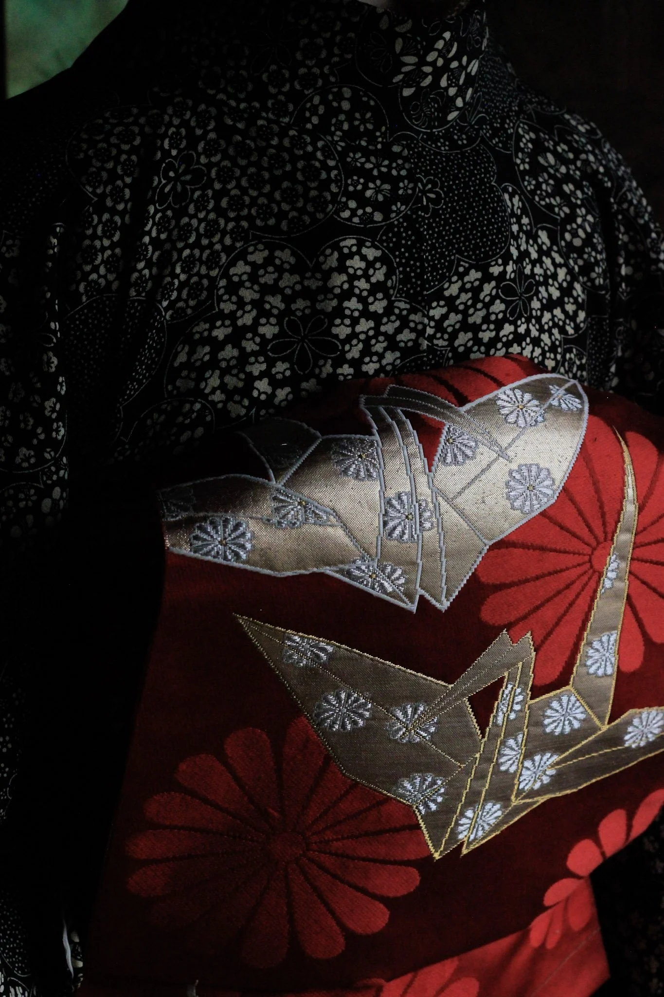 This obi is woven with silk and gold lamé threads. The crane motif is woven with lamé and white which higky reflect light. As you can see on the image below, the cranes shine bright form a certain angle and become more discreet from another angle while the big chrysanthemums at the back darken.