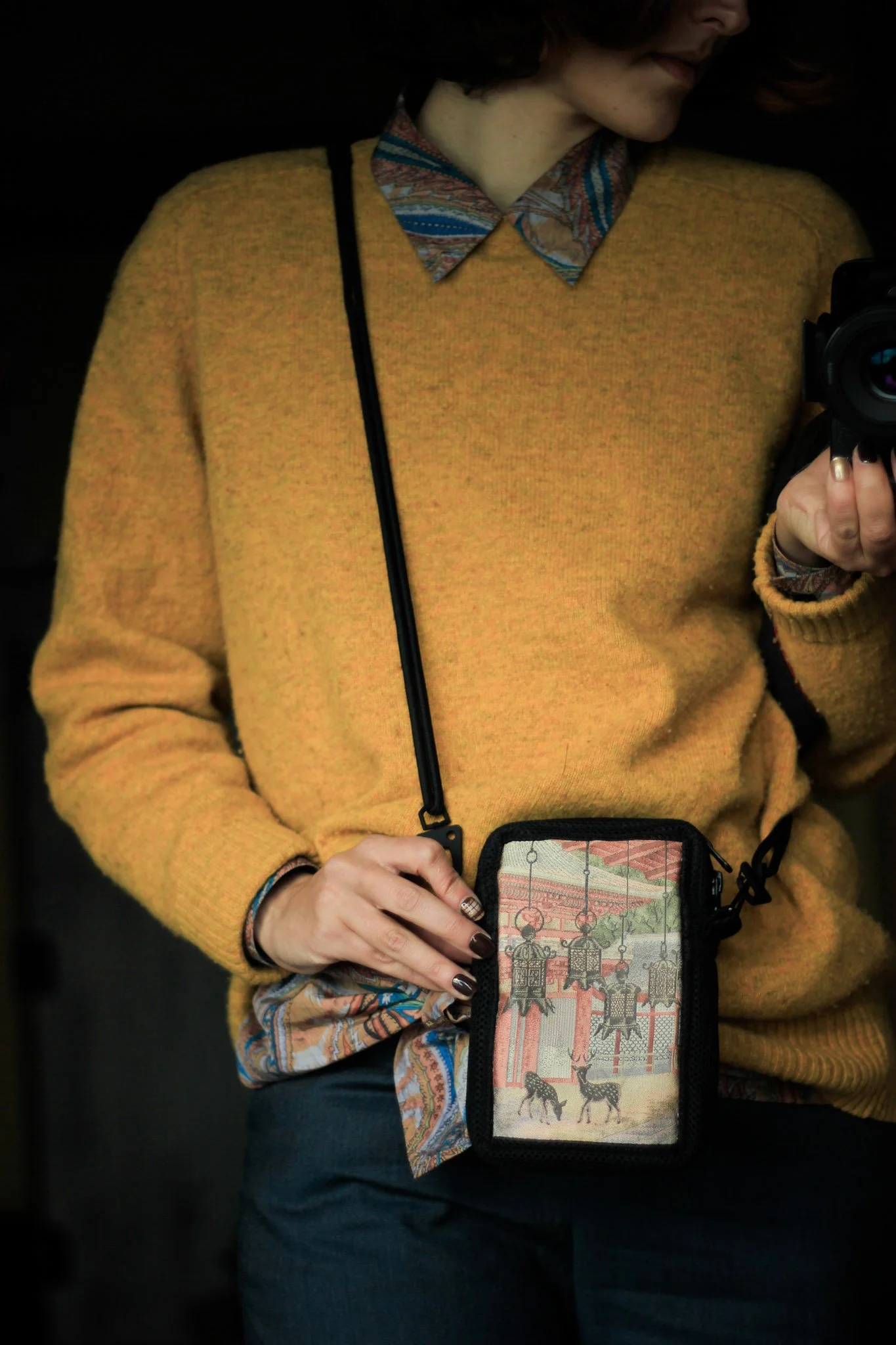 If you ever visited Nara, of course you remember the deers wondering around freely, but you might also have seen Kasuga Taisha, a beautiful shrine built about 1300 years ago, when Nara was the capital of Japan. The shrine is renowned for being the finest example of the Kasuga-zukuri architectural style, which dates back to the early 8th century and incorporates Chinese-style roofs and red, gold, and vermilion decorations. What I found particularly memorable when I visited is the vast collection of hundreds of bronze lanterns hanging all around the building. This obi depicts the. most symbolic elements of Nara: Kasuga Taisha’s lanterns, Kofukuji’s pagoda, and the sacred deers.
