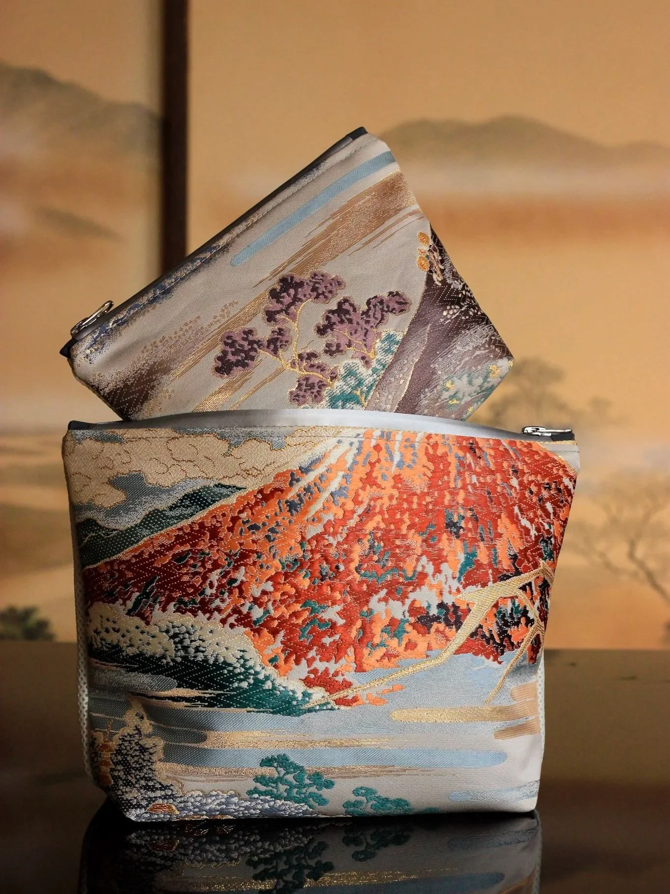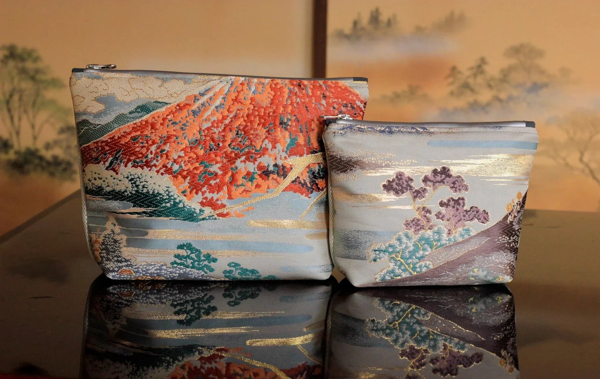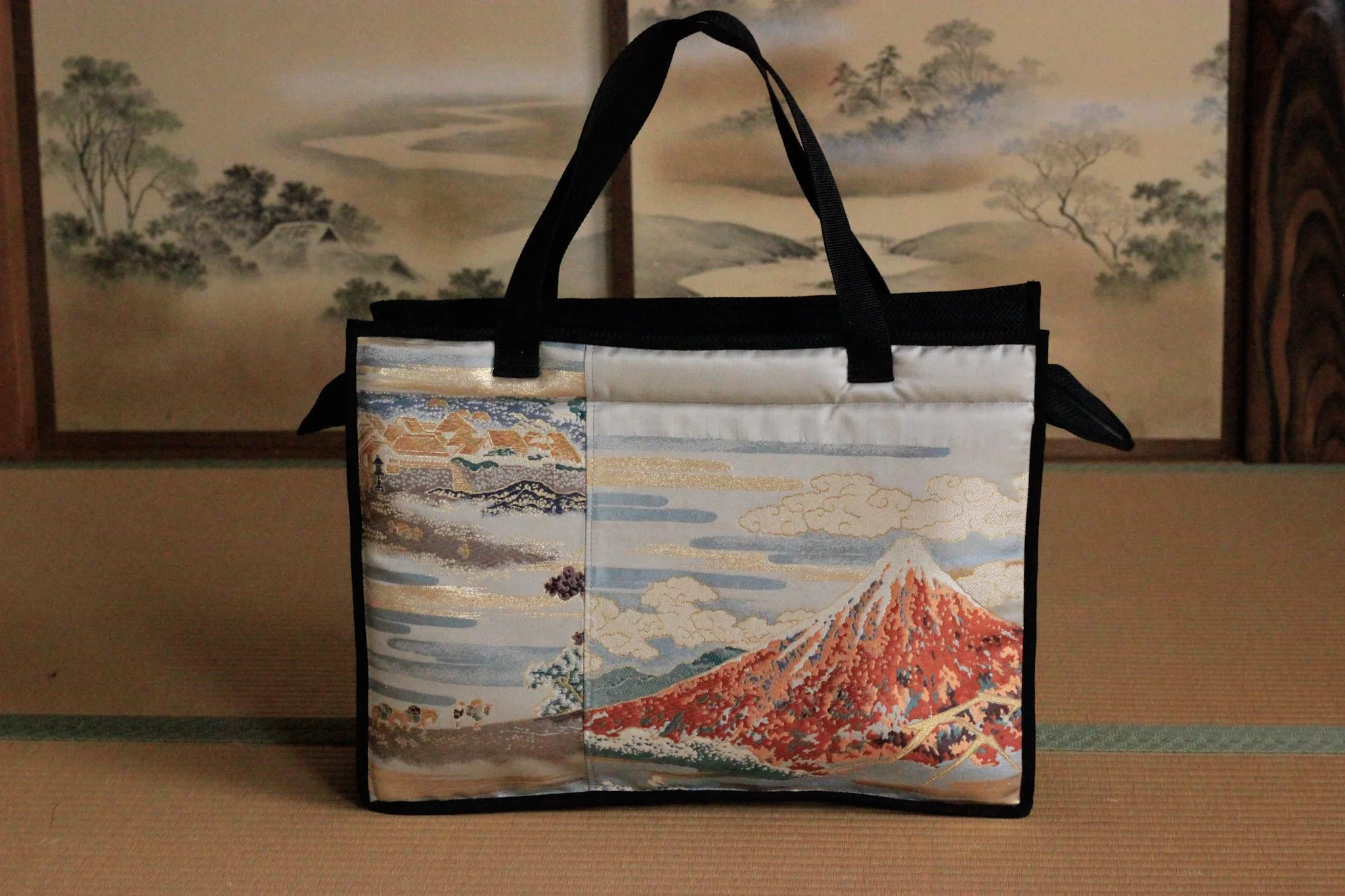 This obi features four of Hokusai’s iconic woodblock prints in the celebrated Thirty-six Views of Mount Fuji series. The weaver has masterfully combined key elements from each scene, rearranging them into a single, harmonious design.