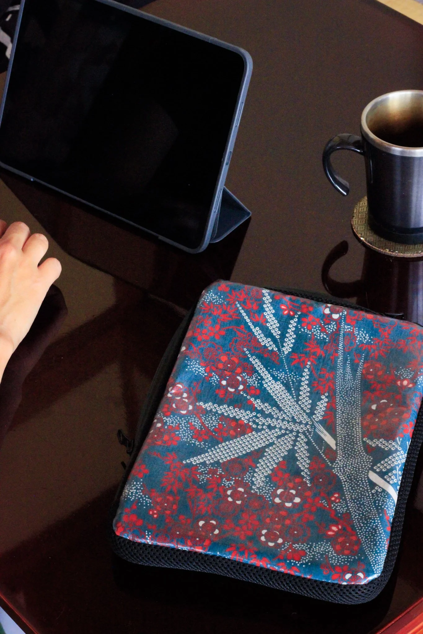 Laminated kimono or obi silk on one side, soft squishy 3D mesh on the other, this light padded sleeve will protect your tablet from chocks and keep it clean inside your bag.
