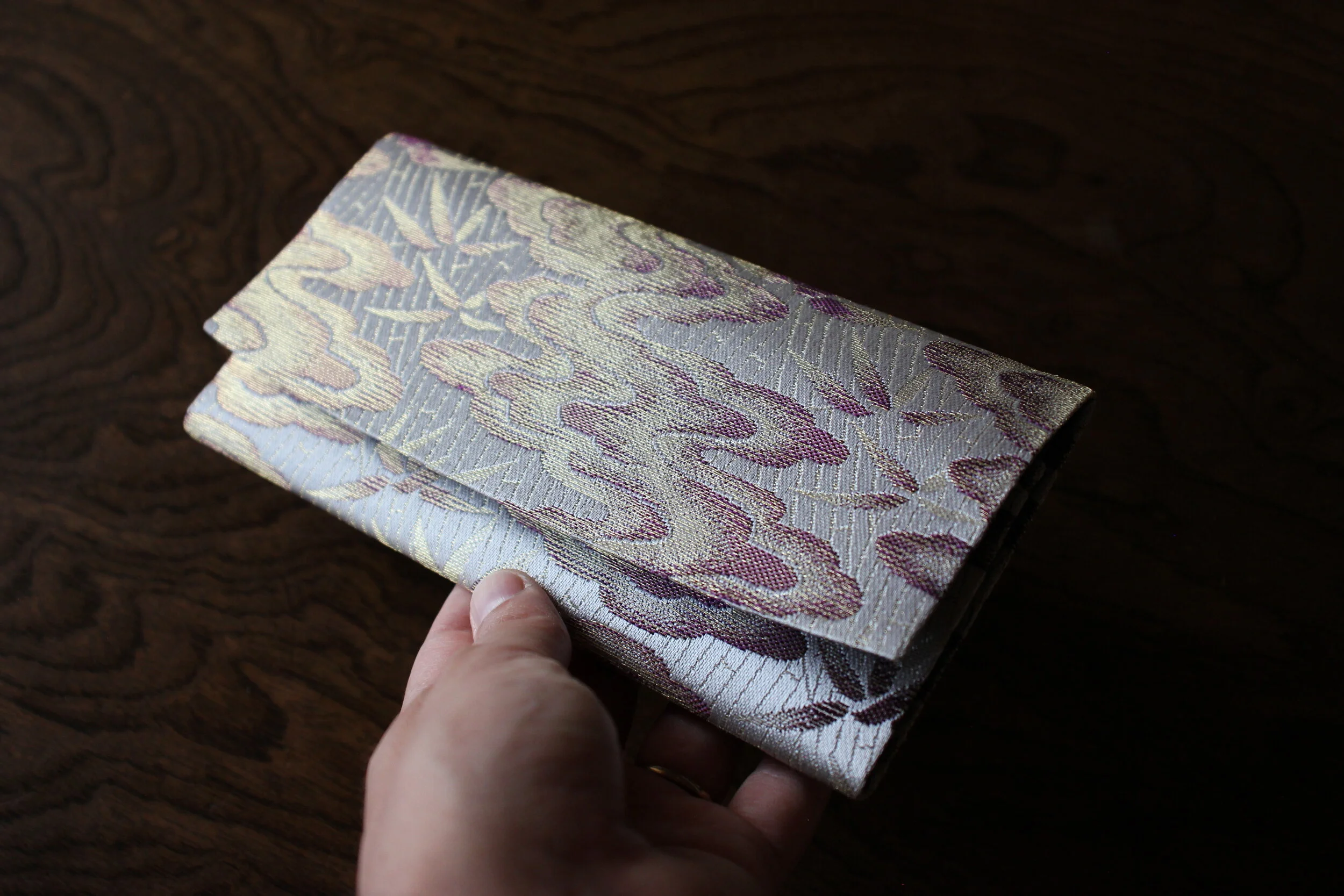 This clutch is made with kimono silk. This kind of long clutch is commonly paired with a formal kimono outfit. Unlike most bags you will find in this shop, the motif is painted onto the fabric, not woven. It means the bag can be worn easily with rich embroidered outfits.